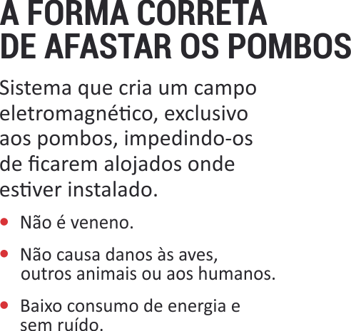 Sistema de manejo de aves com uso de barreiras físicas convencionais ou repelência através de campo eletromagnético que inviabilizam o abrigo e o pouso das aves.
